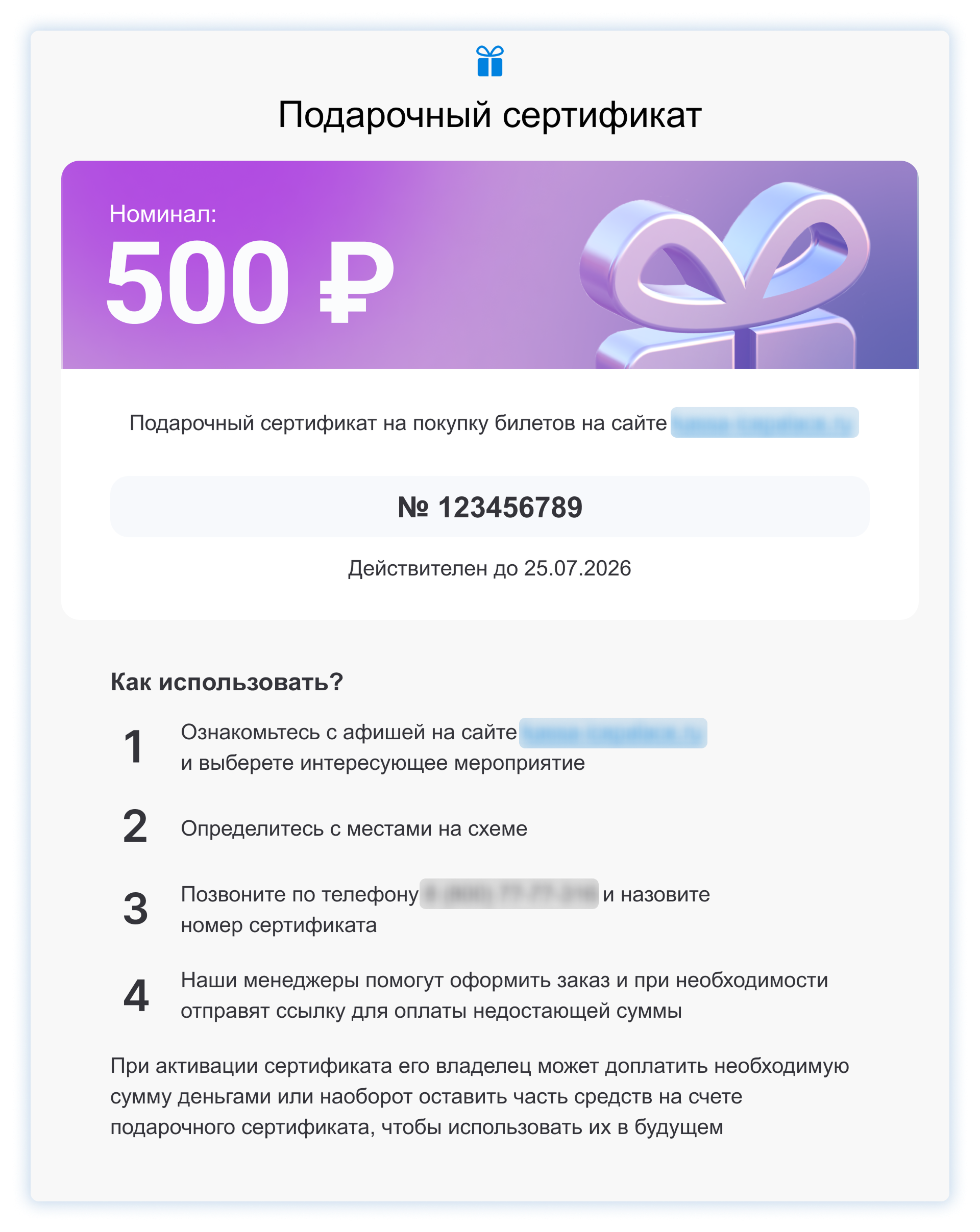 Яркий и красочный подарочный сертификат с инструкцией по использованию придет Вам на почту